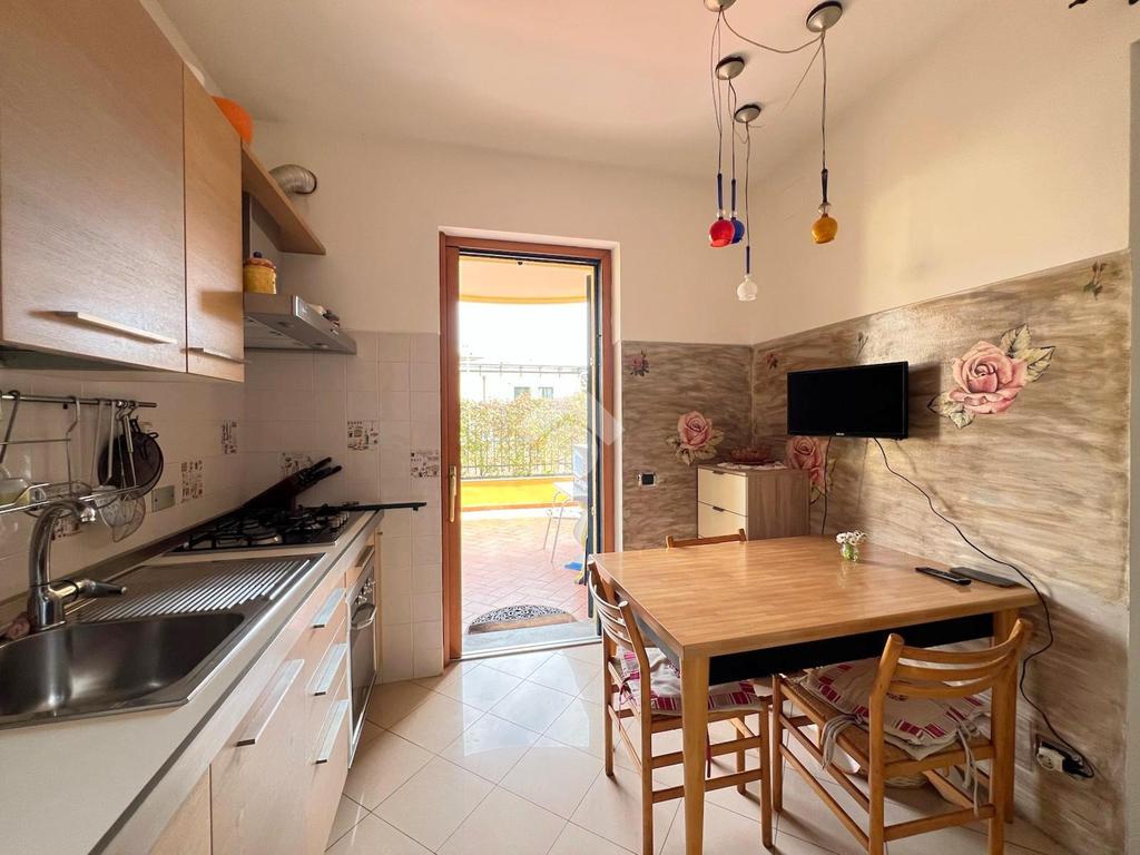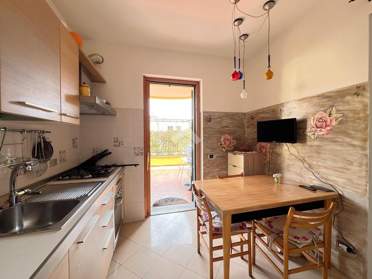 L'ingresso è nel soggiorno, accanto troviamo la cucina abitabile. Entrambi gli ambienti hanno l'accesso diretto al terrazzo.