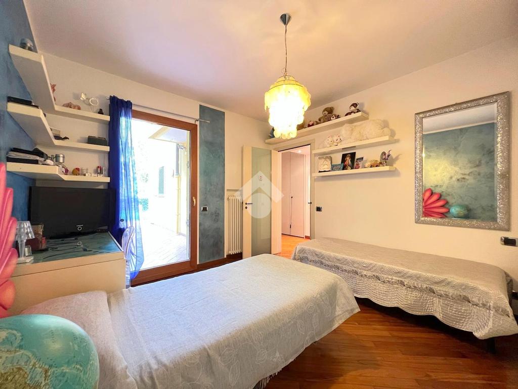 Il pavimento della zona giorno è in piastrelle chiare di gres porcellanato mentre nella zona notte è in parquet.