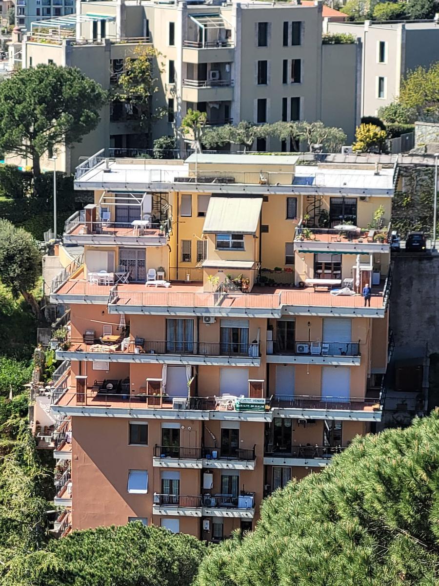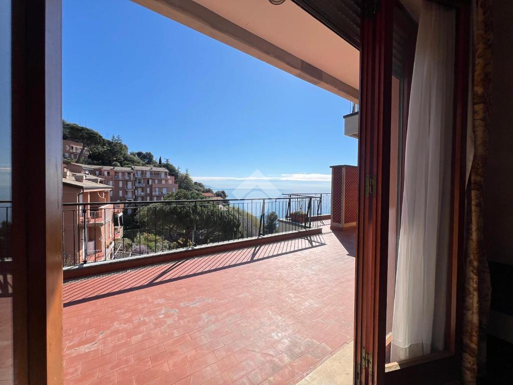 Appena entriamo in casa ci accoglie un salone doppio con due grandi porte finestra che ci conducono sulla terrazza al piano di circa 37 mq con una splendida vista mare; la cucina è abitabile ed attualmente è un vano separato dal soggiorno, ma all'occorenza sarebbe possibile creare un angolo cottura aperto sul salone e ricavare così una terza camera dal letto.